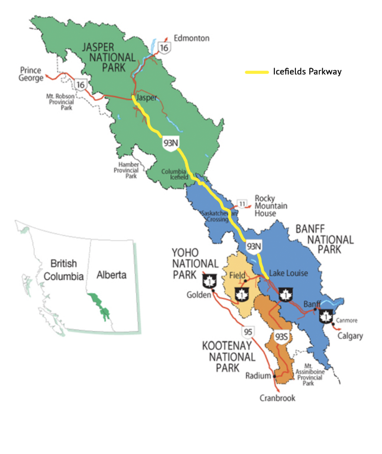 Una de las principales atracciones turísticas para los amantes de la naturaleza son sus increíbles “Rocky Mountains” formadas por varios parques nacionales. Bannf fue el primer parque nacional de Canadá y está considerado el parque principal, seguido de Jasper, Yoho y Kootenay. Cada uno de ellos tiene muchos atractivos naturales y cientos de actividades que hacer en ellos. Te facilito una imagen para que veas la distribución de los parques.
