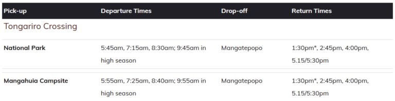 Si no tienes disponibilidad para poder reservar con la opción 1, no pasa nada, hay más opciones. Puedes reservar el servicio de shuttle público, sale desde National Park Village, desde donde sí que puedes aparcar el vehículo de manera gratuita y desde allí tomas un bus que te lleva al inicio de la ruta y al acabar te devuelve al parking desde donde tomaste el bus y tendrás la camper. También te pueden recoger en Mangahuia Campsite, (camping público- Puedes ver los servicios en la app Campermate) por si te quedas ahí a dormir, te puedes servir esta opción. Te adjunto una imagen con los horarios: